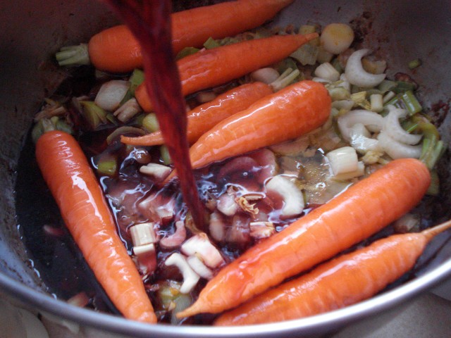 1. Meso lagano zapeći sa svih strana u vrelom ulju u većoj posudi prikladnoj za pećnicu. Izvaditi i odložiti.