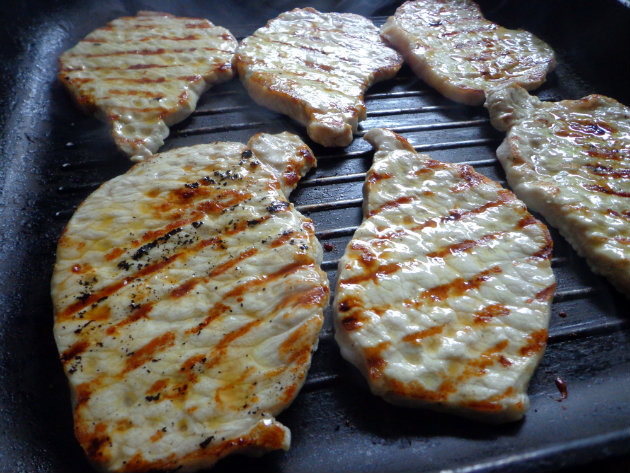 1. S kotleta odstraniti vidljivu masnoću, lagano istući batom za meso i premazati maslinovim uljem. Popapriti.
