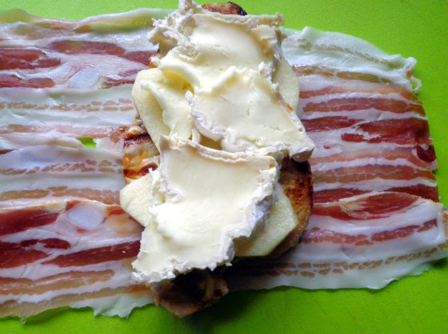 3. Po 4 ploške pancete položiti tako da se preklapaju, pečeno meso položiti na pancetu, na meso rasporediti nekoliko ploški jabuka i na vrh staviti ploške sira.