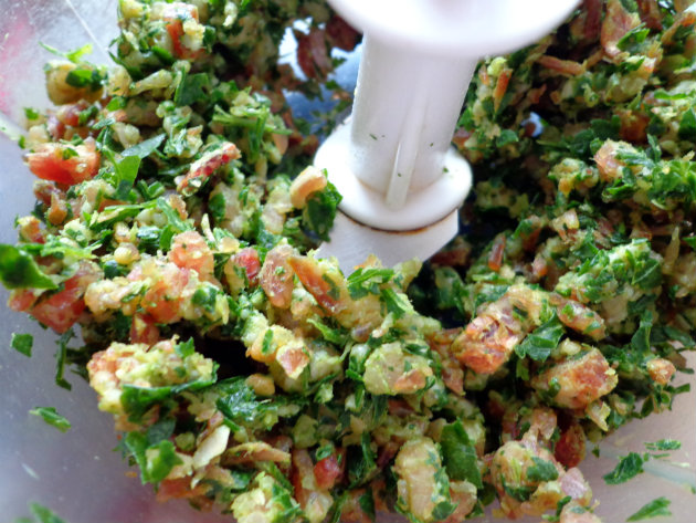 2. Slaninu i peršin natrgan na listiće usitniti u multipraktiku ili sjeckalici. Dodati luku i češnjaku, promiješati.